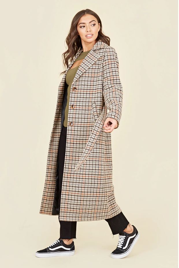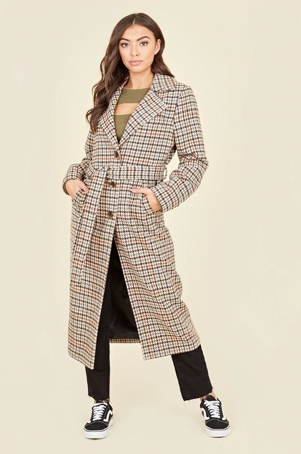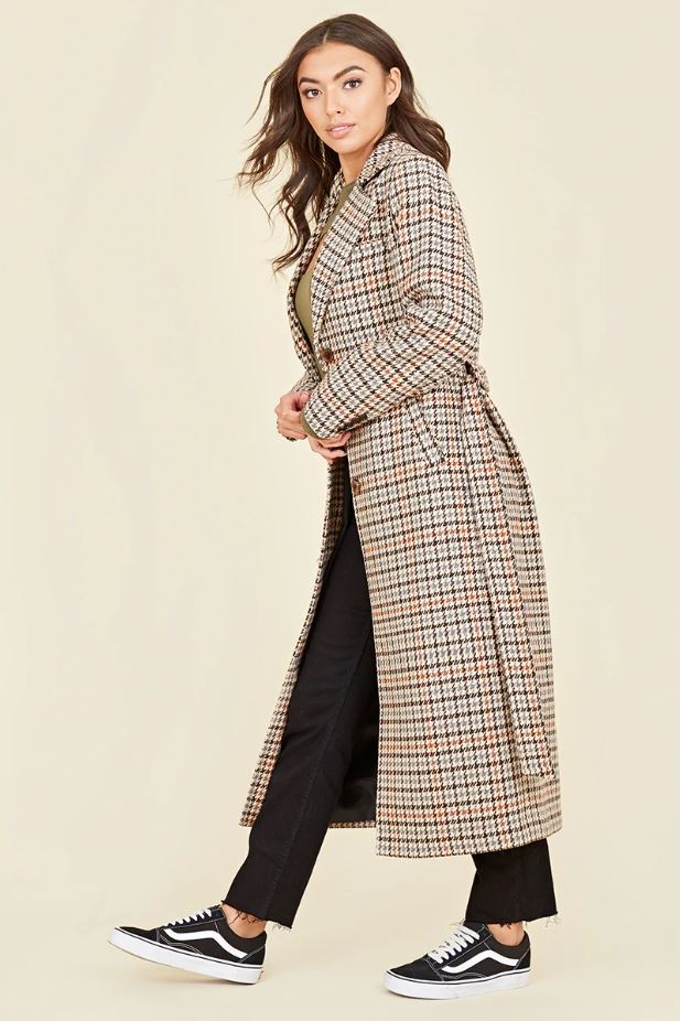 Brown Houndstooth Belted Tortoise Shell Button Trench Coat